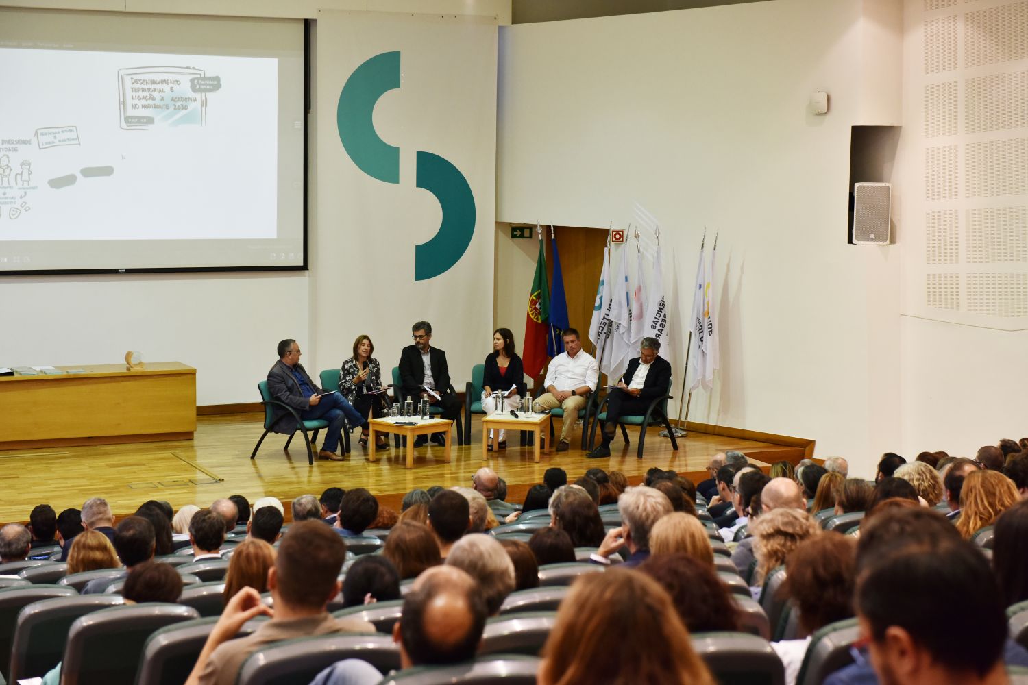 Moderado por Carlos Ferro, editor executivo do “Diário de Notícias”, o painel de discussão “Desenvolvimento territorial e ligação à Academia no Horizonte 2030” foi um dos momentos altos da tarde de celebração, com a apresentação das principais conclusões da iniciativa colaborativa “Vamos pensar o território”, promovido pelo IPS no passado mês de julho.