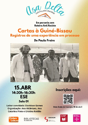 A sessão, que decorre pelas 14h30, na Sala 01 da ESE/IPS, girará em torno da obra “Cartas à Guiné-Bissau: Registos de uma experiência em processo”, publicada pelo pedagogo brasileiro Paulo Freire em 1977, que relata o apoio do autor à construção de um sistema educativo libertador na Guiné‑Bissau pós‑independência, valorizando a aprendizagem mútua e a transformação social baseada na realidade local.