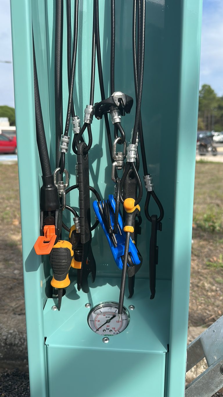 Este posto de trabalho self-service está equipado com suporte para apoio da bicicleta, ferramentas e bomba de ar, permitindo pequenas reparações (mudança e enchimento de pneus, por exemplo) a fim de restabelecer as condições adequadas à circulação.